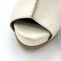 Sophisticated open-toe sandals featuring premium white leather, an adjustable buckle strap, and a stylish 95mm heel. Slight wear on leather adds character. • Adjustable buckle strap for secure fit • 95mm high heel for elegant lift • Open-toe design for a modern look • Durable leather sole h12173