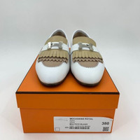 Crafted in Italy, these Hermès Mocassins Royal flats feature premium leather, a sophisticated logo accent, and a multi-hued design. Delivered in original box. • Premium leather construction • Made in Italy • Multi-tone design: white and beige • Hermès logo accent • Includes original box packaging 1100 • Measurements: Size 38 (EU) • No visible flaws; brand new condition