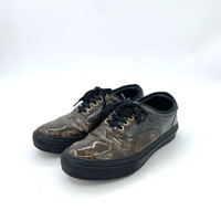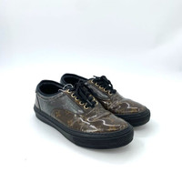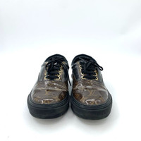These Louis Vuitton monogram sneakers offer a stylish blend of luxury and comfort. The brown and black design is versatile, suitable for various casual settings. The classic monogram print adds a touch of sophistication. Pairs well with both jeans and chinos, providing a refined yet relaxed look. • Low-top design • Gold-tone eyelets • Lace-up closure • Textured rubber sole • Monogram print detail Visible scuffing and peeling on the sides. Signs of wear on soles. H12759