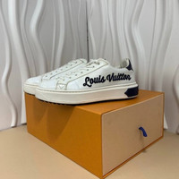 Crafted in Italy, these sneakers feature durable leather with a stylish embroidered Louis Vuitton logo. Their minimalist white and navy design complements various outfits. • Lace-up closure for secure fit • Durable leather composition • Navy rubber soles for traction and comfort • Embroidered Louis Vuitton logo detail • Made in Italy craftsmanship 000635