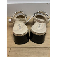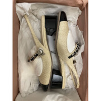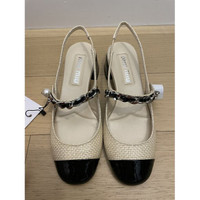 Miu Miu Tan/black Patent Leather And Raffia Slingback Pumps Elegant slingback heels with a woven beige finish and black patent toe cap. Features a chic chain with pearl accent and sturdy block heel design. • Woven textured material for added style • Black patent toe for a polished look • Chain strap with pearl detail • Comfortable block heel with glossy finish • Slingback strap for a secure fit Size: Womens 37 Condition: New With Tags