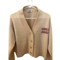 This cardigan presents a refined and polished look, combining luxury craftsmanship with a casual silhouette. The crystal-embellished Miu Miu logo adds a sophisticated touch, making it a signature piece. • Made from soft wool for comfort and warmth • Features crystal-embellished Miu Miu logo • Button-up front closure • Beige hue for versatile styling • Ribbed cuffs and hem for a tailored fit Size: Womens 38 Condition: Pre-Owned Like New