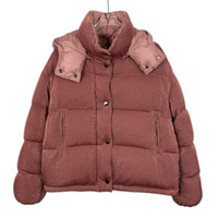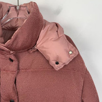 S-Grade Moncler H11437 Caille Series Dusky Pink Glitter Logo Patch Hooded Quilted Down Jacket, size 0 (XS), brand new with tags, originally priced at approximately $2,238 USD, a luxurious and eye-catching piece perfect for winter style.