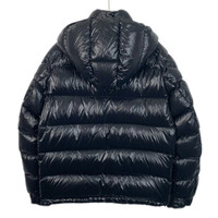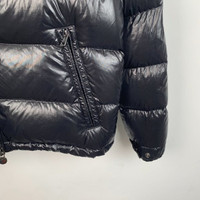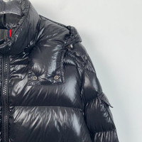 Grade A Moncler H11550 Maya Series Black Logo Patch Hooded Quilted Down Jacket, size 2 (M), 95% new with minor hardware scratches, originally priced at approximately $2,059 USD, a sleek and functional winter essential.
