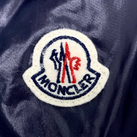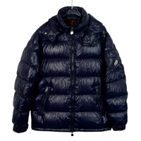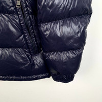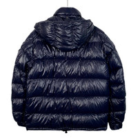 Grade A Moncler H11211 Maya Series Navy Blue Logo Patch Hooded Quilted Down Jacket, size 4 (L), 98% new, a timeless and functional winter essential combining luxury with practicality.