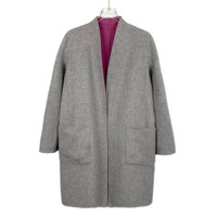 This reversible wool coat offers a professional and versatile look with a flattering V-neck, dual-tone design, and functional belted fit for added sophistication. • Reversible design with pink and gray sides • Belt for adjustable fit • Made of high-quality wool • Features two front pockets • Long sleeves for added warmth H14521