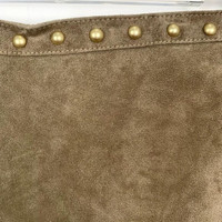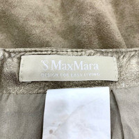 This 'S MaxMara calfskin and silk skirt offers a sophisticated design with studded detailing. It combines luxurious materials with a timeless, elegant style. • Material: Calfskin with silk lining • Studded detailing along the waistband • Mid-length A-line silhouette • Concealed side zipper closure • Professionally finished edges Small faint stains visible on fabric, primarily near lower front and side areas. 009682