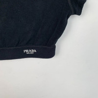 Crafted in Italy, this Prada cropped T-shirt features a sleek black design with an embroidered logo. Ideal for sophisticated casual styling. • Cropped fit with elastic waistband • Embroidered "Prada Milano" logo • Soft and breathable cotton material • Round neckline and short sleeves x14065
