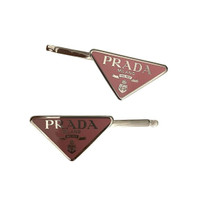 Stylish Prada Milano hair clips featuring a pink triangle logo with silver-tone accents. Comes with an original Prada pouch for secure storage. • Durable metal construction • Pink enamel triangle logo • Silver-tone finish • Includes original Prada pouch • Classic and elegant accessory Size: Womens OS Condition: Pre-Owned