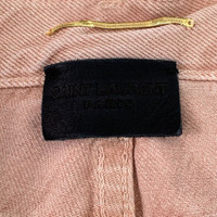 These Saint Laurent pink jean shorts feature a stylish frayed hem and premium craftsmanship. Designed in Italy, they offer a contemporary yet timeless look. • Frayed hem adds a casual, edgy touch • Five-pocket design for functionality • Button and zip closure for secure fit • Made from high-quality materials • Subtle pink tone for versatile styling Slight black spot near seam, barely noticeable. h12007