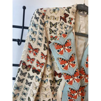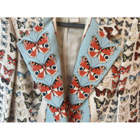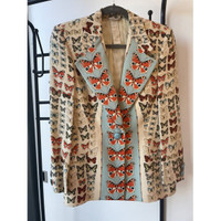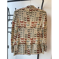This Versace blazer jacket features an intricate butterfly print, exemplifying high fashion and elegance. Its bold design with blue button accents offers a unique and stylish look. Made for the discerning woman, it can enhance a wardrobe with its designer appeal and artistic flair. • Button closure • Long sleeves • Butterfly print design • Suit lapel collar Size: Womens 38 Condition: Pre-Owned Like New