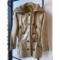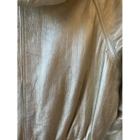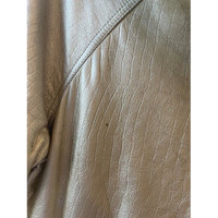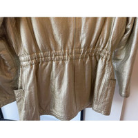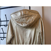 This vintage Leather Versace gold metallic jacket exudes a timeless elegance and offers both style and warmth. Its hooded design ensures protection against the elements while maintaining a fashionable look. The jacket's unique texture adds a sophisticated touch, making it a versatile piece in any wardrobe. • Double-breasted button closure • Front pockets • Elasticized waist • Hooded design Stains visible on the surface, particularly around the front,shoulder area. Size: Womens 38 Condition: Pre-Owned Fair