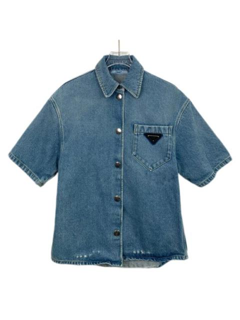 Prada Womens Short-Sleeve Denim Button-Up Shirt With Chest Pocket & Logo Patch