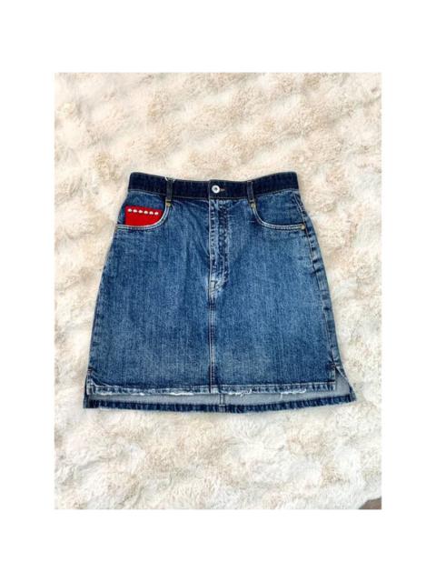 Miu Miu Distressed Denim Mini Skirt With Red & Blue Studded Pocket Accents