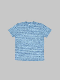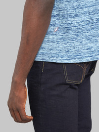 The new Pure Blue Japan Kasuri tee is one of the most stunning indigo pieces we've ever laid eyes on. Inspired by one of Japan's oldest dyeing techniques, Kasuri (絣染め), this garment blends rope dyeing with unique methods to create a fabric where the yarn has randomly varying shades of dark and light. The result is a distinctive Tenjiku material that exudes a subtle Japanese aesthetic and a refreshing feel. Each piece carries a unique touch due to the varying color tones, making every T-shirt one-of-a-kind. The soft, breathable fabric ensures comfort, while the indigo hues provide a versatile, stylish look that pairs effortlessly with any outfit. Additionally, the signature Pure Blue Japan "shoai" embroidery, depicting the Indigofera leaf, further exemplifies the brand's commitment to excellence. All PBJ tees run smaller in size compared to your regular American size. Typically, if you wear a size M in American t-shirts, you will need to select a size 4 (L) in this. However, individual body types can vary, so, as always, we recommend consulting our size chart for the perfect fit. Pure Blue Japan is the dream of Kenichi Iwaya. Passionate about denim, he grew up in Okayama and acquired experience working in different mills around the region, until in 1997 he decided to create his own brand. Ever since, Iwaya-San has been obsessed with producing incredible fabrics with unique, slubby textures and a distinct character. This is why he only works with shuttle looms from Ibara, Okayama, using only the best cottons from the United States and India. Since its emergence until today, Pure Blue Japan has consolidated its position as one of the touchstone labels in Japanese Denim, and its excellent work has established it as one of the masters of indigo dye. Details - 100% long-staple cotton - Midweight - Slim fit - Pure indigo Kasuri-dyed - Crewneck - Washed. No further shrinkage expected - Signature Pure Blue Japan "shoai" embroidery (Indigofera leaf) - Made in Japan
