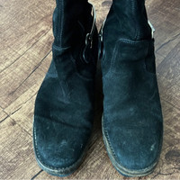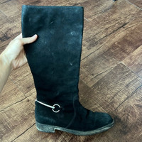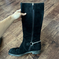 Used & have signs of wear / imperfections - dirt, markings, scuffs, flaws are shown. The bottoms need repaired. Little rip on back heel area of one of the boots. Gucci Authentic horsebit accent black suede mid-calf (or knee high depending how tall or short you are) riding boots Size 39 (please know your proper sizing in this brand) Does NOT come with original box & does NOT come with dust bags Keyword tags. classic elegant sophisticated timeless traditional KJP classy girls wear pearls designer luxury iconic logo silver neutral Sold as is (no returns)