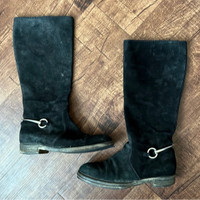 Used & have signs of wear / imperfections - dirt, markings, scuffs, flaws are shown. The bottoms need repaired. Little rip on back heel area of one of the boots. Gucci Authentic horsebit accent black suede mid-calf (or knee high depending how tall or short you are) riding boots Size 39 (please know your proper sizing in this brand) Does NOT come with original box & does NOT come with dust bags Keyword tags. classic elegant sophisticated timeless traditional KJP classy girls wear pearls designer luxury iconic logo silver neutral Sold as is (no returns)