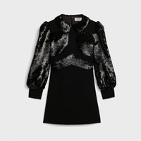 Stunning black sequined dress with Peter Pan collar Runway piece, SS19 Look 12, From Celine Spring 2019 Hedi Slimane It was a piece to order on the Celine website, SS19 Peter Pan babydoll Black sablé mini dress CELINE SS19 BABYDOLL DRESS IN SABLÉ WOOL WITH EMBROIDERED PANELS As seen on Zooey Deschael and Pevita Pearce from the friends&family sale, wool outer, silk lining, with a long zipper, buttons on the cuffs for the sleeves, size medium-it 42, new with tags, rp 5500€