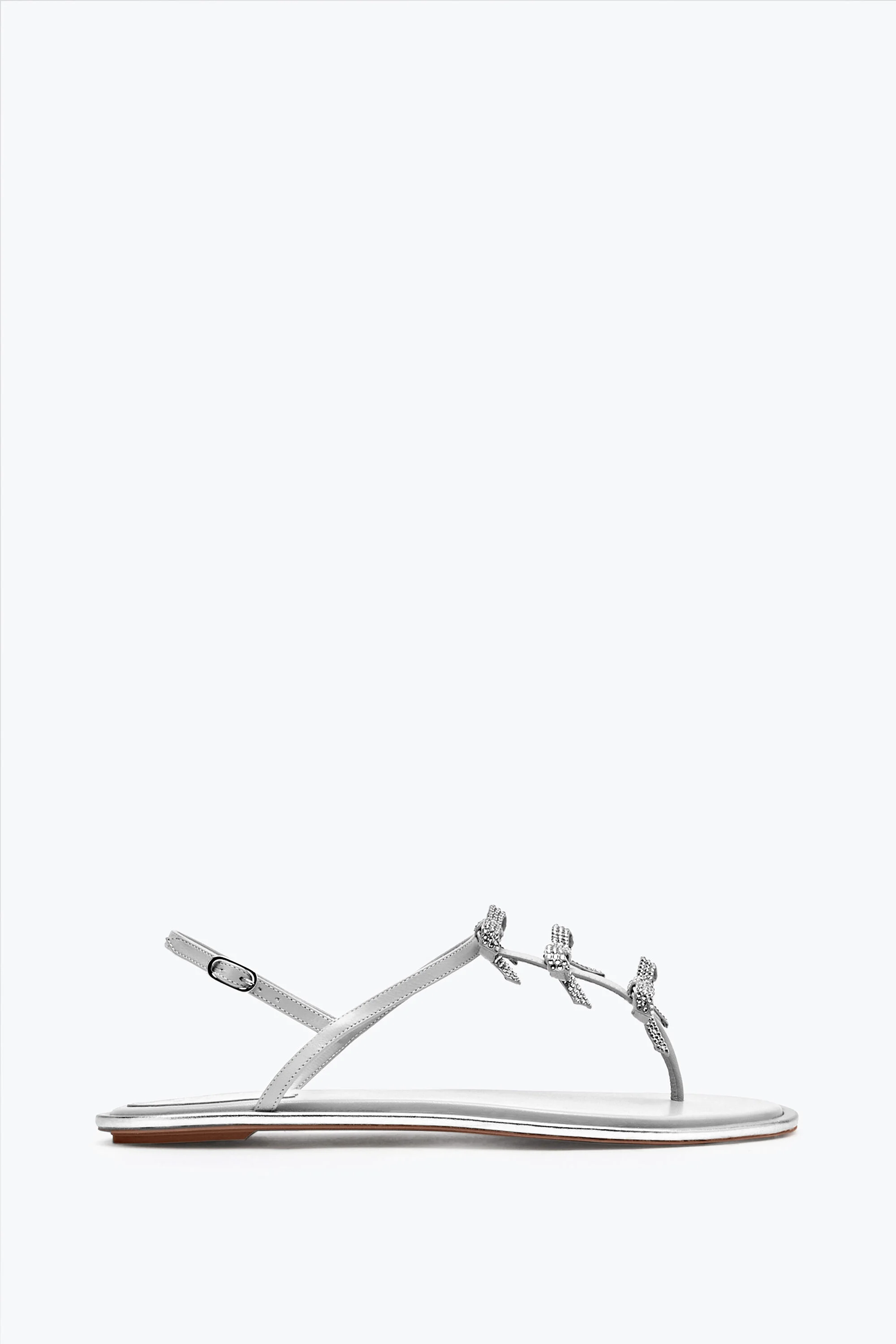 Refined in its simplicity, the Caterina silver thong sandal effortlessly complements any outfit. Its minimal silhouette is embellished with three bows covered in silver crystals, which give a romantic and feminine touch to even the most casual looks. - Satin, leather - Hand-applied rhinestones - Heel height 0.4” - Round toe - Made in Italy Ref. C12018-010-R001V232