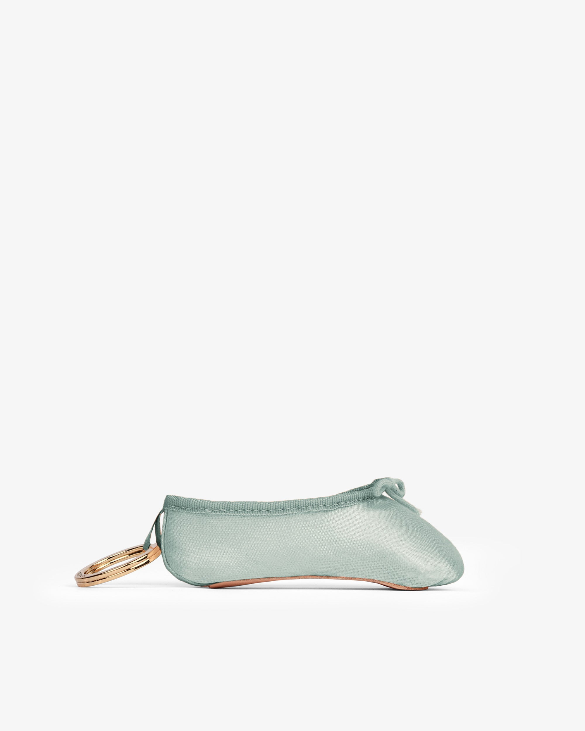 This ballet shoes keyring will find its place on the dance bags or on the small cases. The identity colors are a reminder of the ballet codes. Small version of the real ballet shoes, this nice keyring comes within the Repetto DNA. Material: Satin Color: Aqua green Dimensions: Height 3,5 cm x Width 3,5 cm x Depth 11 cm Details: • Light gold ring • Insole with Repetto logo Ref: A0097S-077 Product details Light gold finish ring. Repetto logo insole.
