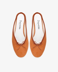 Repetto revisits its great successes by transforming its ballerina into a mule version with a small heel. Inimitable suppleness, signature lace and grosgrain trim place this new model in the great tradition of Repetto's iconic designs. Made in France, using the stitch-and-return artisanal know-how, the Camille mule combines unique comfort with elegance. Material: Goatskin suede Color: Cinnamon Heels height: 3 cm Original country: France Details: Cowhide leather insole. Cotton lining. Leather wrapped heel. Stitched and returned. Leather sole. Benefits of the selected manufacturing process: Stitch-and-return is the historical manufacturing process of Maison Repetto, developed by Madame Rose Repetto in 1947. The sole is sewn inside out before being turned inside out. This is an obvious way to create a flexible and emotional model. Ref: V4183CV-1476-35