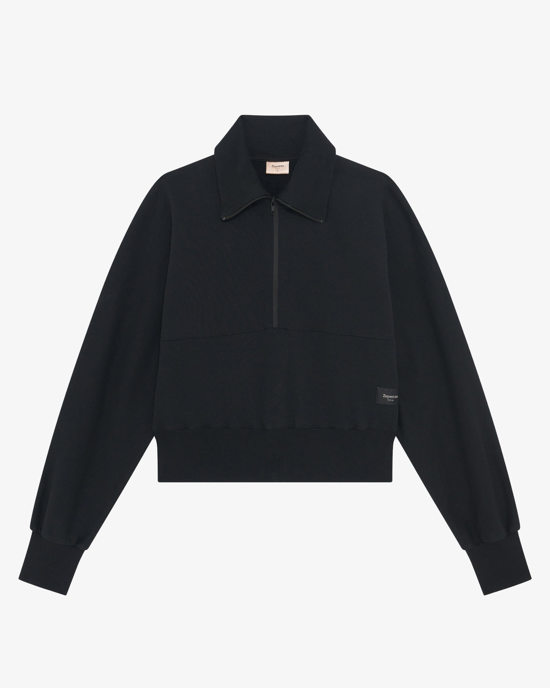 Comfortable, soft and warm are the key words of this fleece sweatshirt. Material: Fleece Composition: 87% Cotton - 12% Polyester - 1% Elastane / Waist: 95% Cotton - 5% Elastane Color: Black Original country: Portugal Details: High collar with zip. Loose fit. Low armholes. Ref: S0620-410-XS Product details High collar with zip. Loose fit. Low armholes.