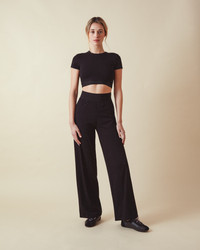 These high-waisted pants are soft and easy to move with, thanks to their loose fit and elasticated waistband. The drawstring at the bottom of the leg can be worn straight or tight. High waist and loose fit Wide elastic waistband Elastic drawstring at bottom of legs Outside leg length 110 cm (for a S)Material:Viscose elasthanne Composition:95% Viscose - 5% Elastane Color:Black Original country:Portugal Ref: S0559-410-XS Product details Viscose pants. Loose fit. Wide elastic waistband. Elastic drawstring at the bottom of the legs. R logo in transfer on the side. Repetto label on back.