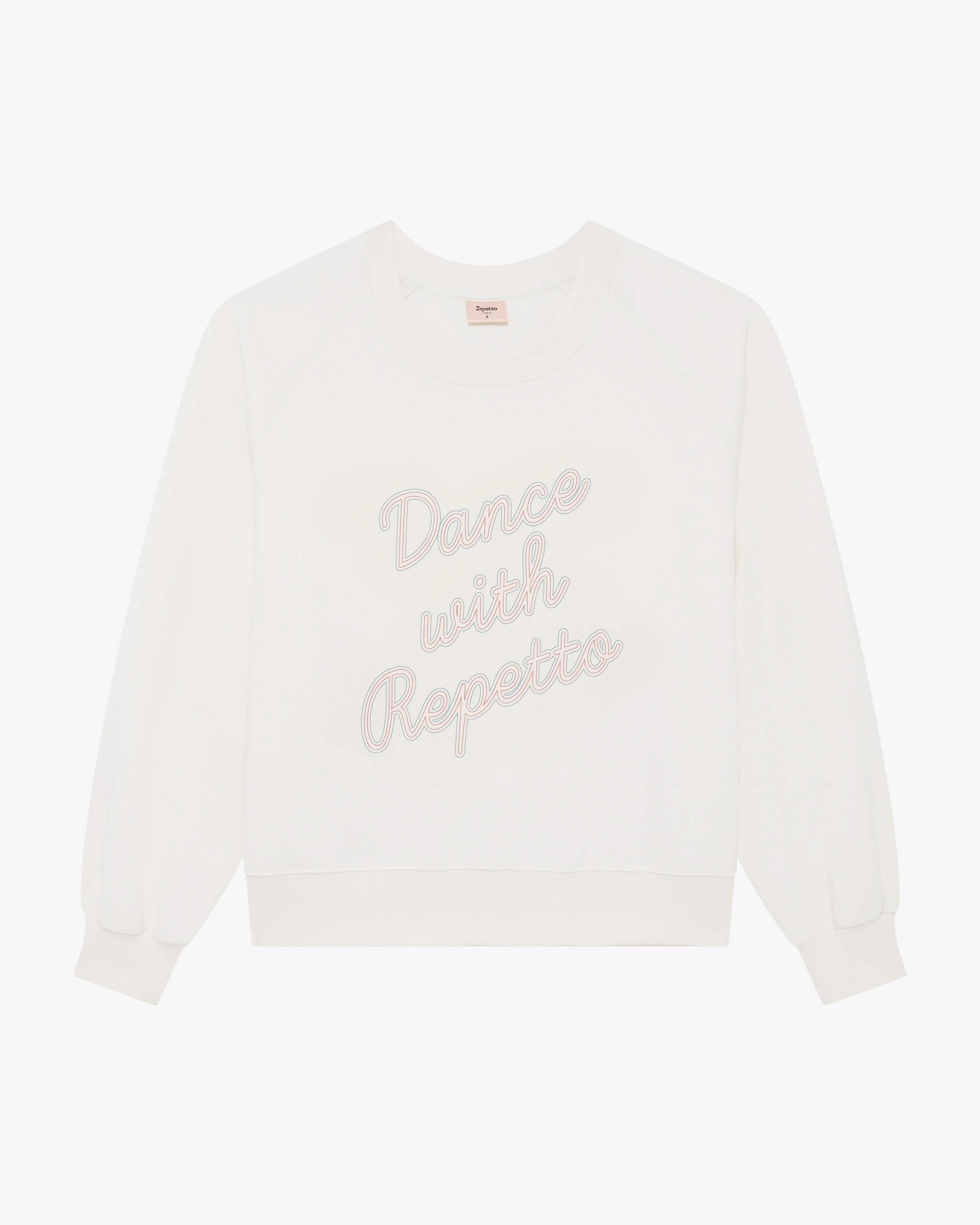 Smooth on outside and fleecy on the inside, this soft and mid-weight French terry is a true promise of warmth and comfort. Material: Cotton Main: 89% Cotton – 11% Polyester Rib: 95% Cotton – 5% Elastane Color: Ivory Details: Embrace the vibrant and colorful spirit of the 80s with our Dance with Repetto capsule. A fusion of retro sophistication and elegance to accompany your every move with style. This crewneck sweatshirt is an iconic piece of our capsule collection. With its oversized fit and logo on the front, it's the perfect companion for your workout sessions or for a vintage and casual look every day. - Designed for an over-sized look—size down for closer fit - Ribbed cuffs and hem Ref: S0711-214-XS