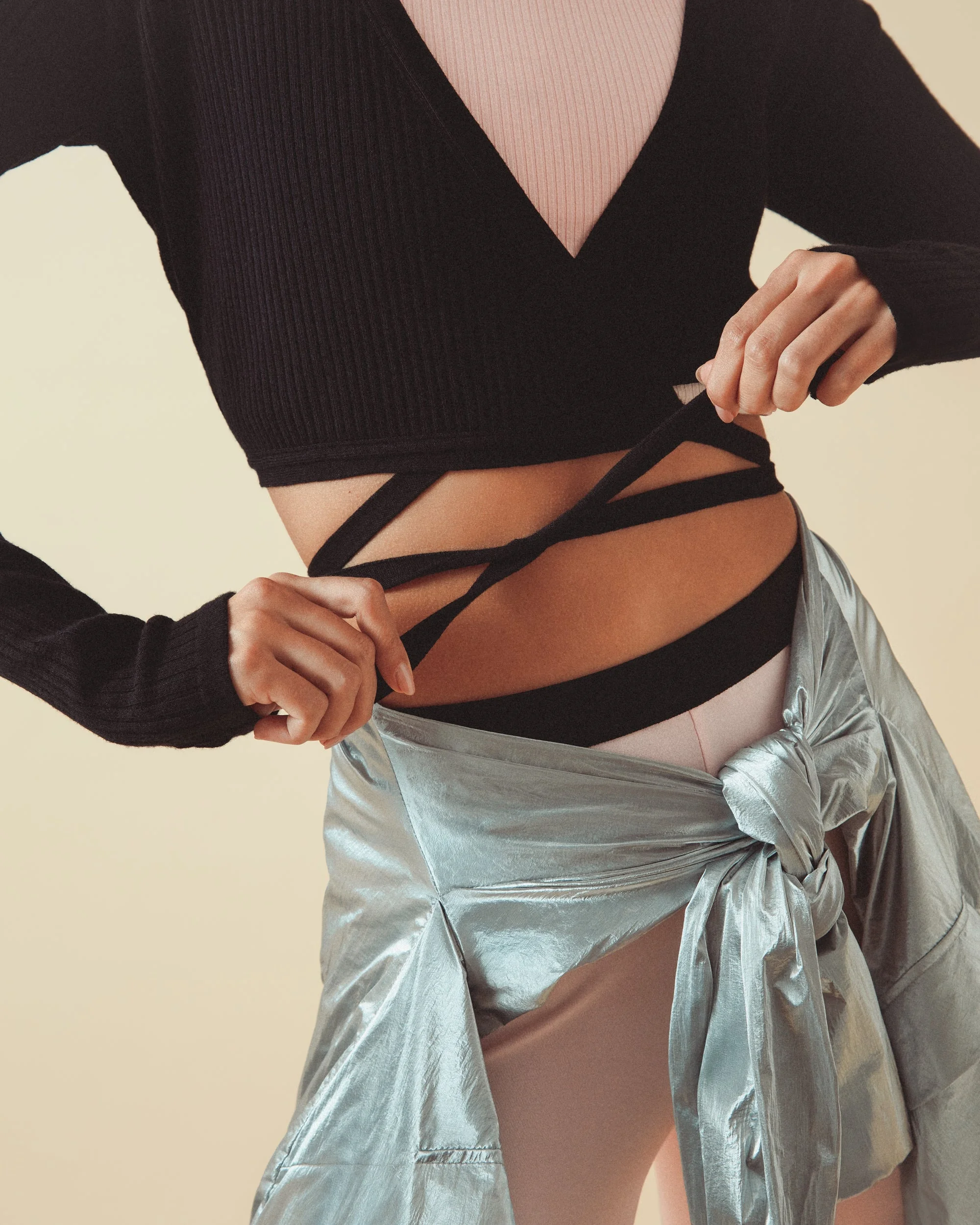This wrap-over is an iconic style of the ballet dancer wardrobe, twisted in a modern and feminine look with its cropped cut. A must for soft practice, or for a chic and comfy everyday wear. V-neckline To tie around the waist for a feminine, elegant look. Designed for a relaxed, cropped fitMaterial:Tricot Composition:89% Viscose - 8%Polyamide - 3% Elastane Color:Noir Original country:Roumania Ref: S0669-410-XS