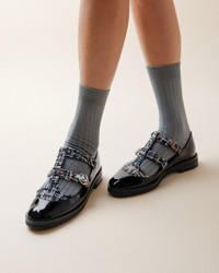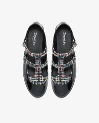 Inspired by the retro elegance of T-bar shoes, the Salome College reinterprets this classic with a distinctly modern twist. Featuring an intricate strap design that ensures perfect foot support, it seamlessly combines style and comfort with a confident allure. Its sole, an innovation of the House, adds a structured and contemporary touch. A style of bold refinement for a unique and modern elegance. Material : Patent leather/ Textile Color : Black Heels height: 1,5 cm Country of origin: France Details: Cowhide leather insole. Leather lining. Stitched and returned then cemented. TPU sole. Benefits of the selected manufacturing process: Stitch-and-return is the House's historic manufacturing process, perfected by Madame Rose Repetto in 1947. The sole is sewn to the top of the shoe, inside out, before being turned inside out. This technique gives the shoe unequalled suppleness and comfort. The rubber sole used on this model provides optimum resistance. Ref: V4243VTWPD-410-34 Product details Cowhide leather insole. Leather lining. Stitched and returned then cemented. TPU sole.