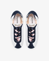 At the crossroad of a city sneaker and a ballet shoe, the Meline is inspired by ballet flat details. Its double satin laces, thin sole and pleated collar, recall the world of dance at the heart of the House's heritage, offering femininity and incomparable comfort. Material : Sheepskin and goatskin leather Color : White / Classic blue Heels height: Without heel Country of origin: Tunisia Details: Cowhide leather insole. Lambskin leather lining. Sacchetto construction. Rubber sole. Benefits of the selected manufacturing process: The noble and complex sacchetto construction is a manufacturing technique in which the soft leather of the lining is sewn to the leather of the shoe's upper, forming a small bag ('sacchetto' in Italian). The supple leather wraps around the foot like a glove, offering a unique level of comfort unique to the House of Repetto. Ref: V4230MCVD-647-35 Product details Cowhide leather insole. Lambskin leather lining. Sacchetto construction. Rubber sole.
