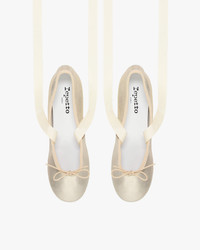 The Sophia ballerinas are an iconic model of the Maison Repetto. Inspired from the half-pointe shoes, they are without distinction from the right foot to the left and laced with a satin ribbon. These ballerinas with urban style proudly bring a touch of classical dance in the city, for a graceful and singular look. Material: Nappa calfskin Color: Light gold Original country: Morocco Details: Ballerinas with satin ribbon. Cowhide leather insole. Cotton lining. Leather sole. Ref: V4197VEM-418-35