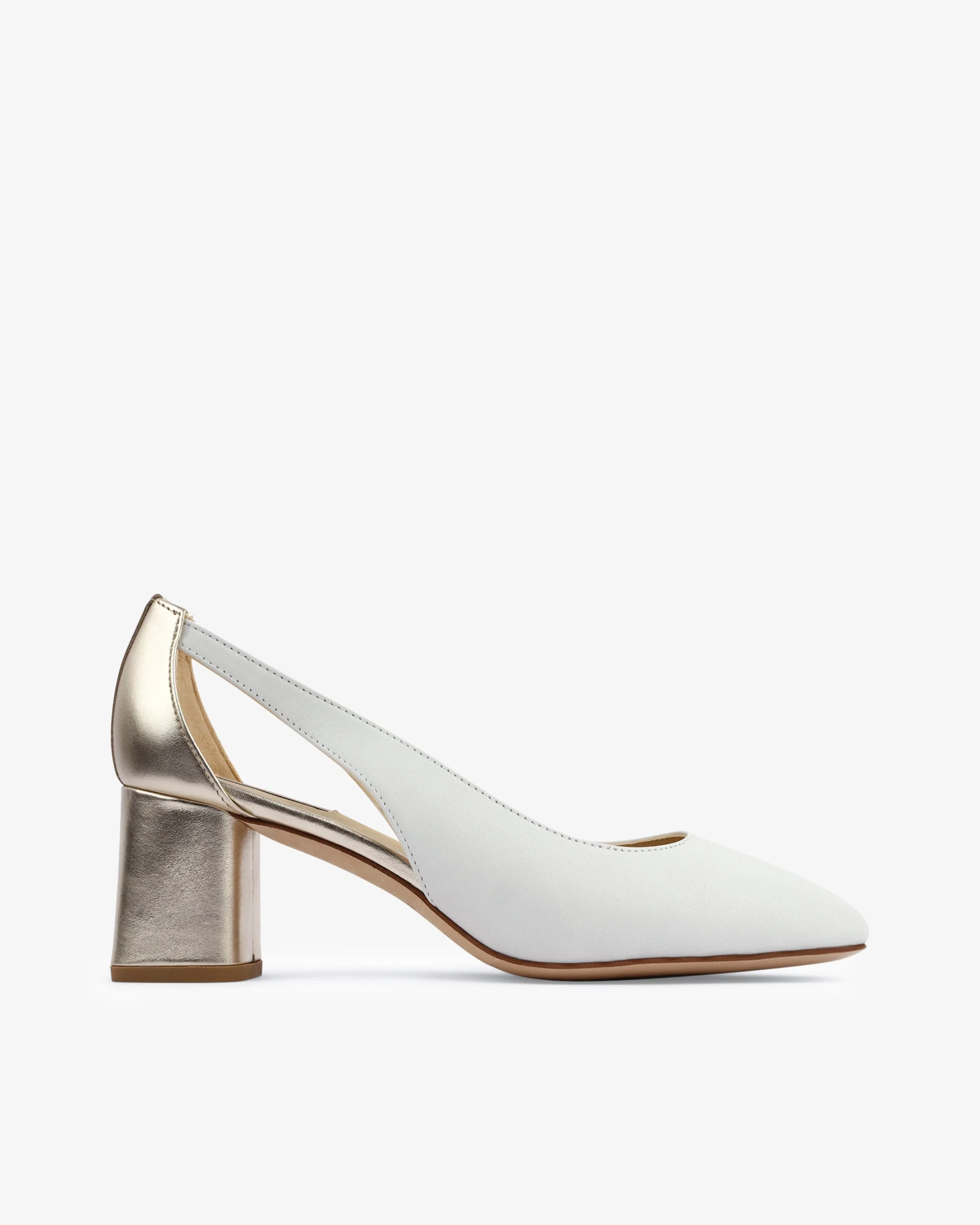 The Terry is an openwork pump with feminine, sensual lines. The square toe and heel with rounded edges give them a retro yet modern look. Made using “Sacchetto” construction, they boast Repetto’s trademark flexibility. Even at 2.4 inches, comfort is guaranteed on long outings in the city. Material : Cowhide leather Color : White / Light gold Heels height: 6 cm Country of origin: Spain Details: Insole and lining in lambskin. Leather wrapped heel. Leather sole. Sacchetto construction. Benefits of the selected manufacturing process: The noble and complex sacchetto construction is a manufacturing technique in which the soft leather of the lining is sewn to the leather of the shoe's upper, forming a small bag ('sacchetto' in Italian). The supple leather wraps around the foot like a glove, offering a unique level of comfort unique to the House of Repetto. Ref: V4043SVEAGMD-1442-35 Product details Insole and lining in lambskin. Leather wrapped heel. Leather sole. Sacchetto construction.