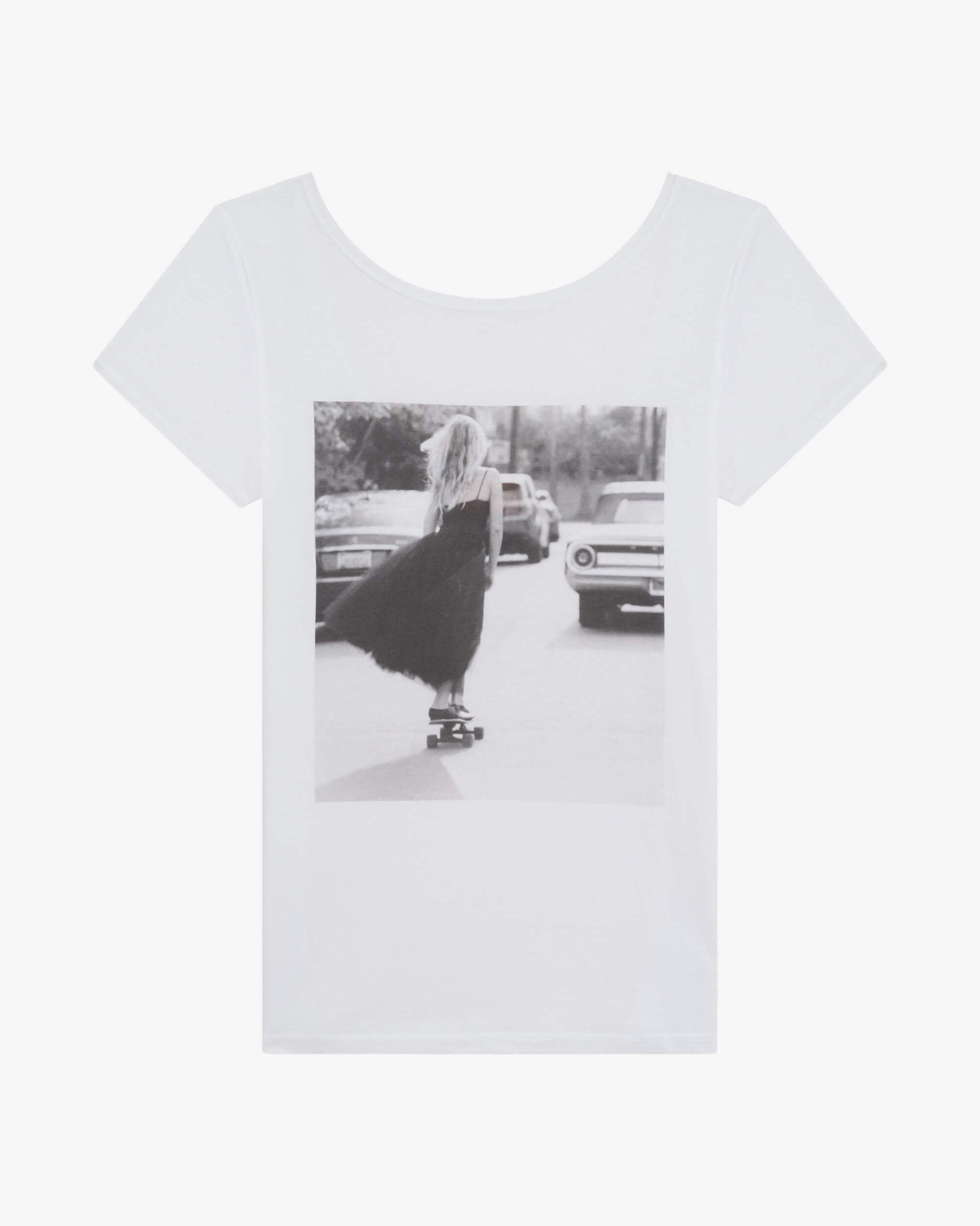 This t-shirt celebrates the emancipating femininity behind this dancer who takes hold of the skateboard, a symbol of the freedom so dear to the House of Repetto. Material: Tencel® Composition: 65% Tencel® - 35% Cotton Color: White Original country: Portugal Details: Short sleeves. Deep back neckline. Straight shape with a slight bend. Photo print on front. Repetto label on back. Ref: S0595-050-XS Product details Short sleeves. Deep back neckline. Straight shape with a slight bend. Photo print on front. Repetto label on back.