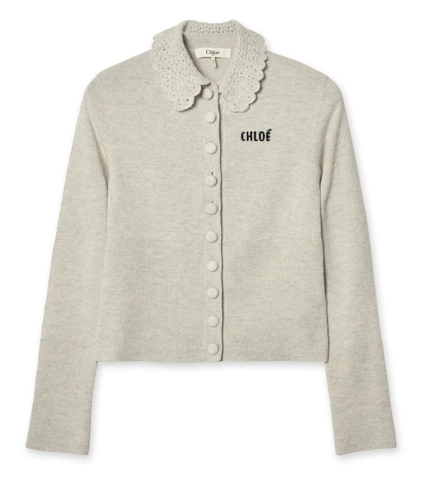 DESCRIPTION Fitted cardigan in a multistitch wool knit, featuring a guipure collar, fabric-covered buttons and Chloe logo embroidery at the chest. PRODUCT DETAILS Fitted cardigan outer shell: 100% Wool Fit: fitted - The model is 5'10" (178 cm) and wears a prototype in size S - Collared cardigan - Fabric-covered buttons through front Color: Sweet Grey Item code: CH26SMC0353000N CARE INSTRUCTIONS To preserve the integrity of your garment, please refrain from washing, entrusting its care to professional cleaning services for optimal maintenance. This garment cannot withstand any bleaching agent. To maintain its shape, gently iron this garment at a maximum sole plate temperature of 110°C, taking care to avoid any harsh pressure while ironing. Entrust this garment to a specialist for mild cleaning with tetrachloroethylene and solvent F, ensuring its delicate nature is maintained with the most care. To best preserve its form and texture, please do not tumble dry this garment. To maintain its delicate nature, do not wet clean this garment. TRACEABILITY Better traceability is central to improving our materials as well as social and environmental practices. Dyeing: Italy