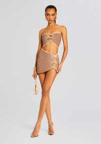 Raditate confidence in our Adelie Top. This strapless cropped style features center diamond shaped cutouts fastened by gold buttons and a pink lined pattern for a pop of pastel color. Shown here in Metallic Caramel. - 60% Rayon, 32% Nylon, 3% Spandex, 5% Metallic - Made in China - Model is 5'10" wearing size S - Style No. - PF24-7008
