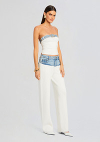 Combine style and versatility in SER.O.YA's Chani Knit Denim Pant. Featuring a wide leg silhouette, these knit pants offer a trendy and relaxed look that's perfect for any occasion. The denim waist detail adds a touch of sophistication and versatility, making these pants stand out from the rest. Pair with the Etta Knit Denim Top or Cara Knit Denim Top. Shown here in White/Coastline. ABOUT SER.O.YA Established in 2020, SER.O.YA is a New York-based ready-to-wear label founded with the intention to upgrade and refine your wardrobe. With a focus on crafting effortlessly cool and timelessly luxurious designs—SER.O.YA creates minimalist collections powered by maximum style. Everyday essentials in the form of breathable knits, vintage inspired denim, and ultra-luxe fabrications are interchangeably worn for easy dressing that never compromises. With versatility at its core, the brand’s simple yet significant aesthetic comes through in classic silhouettes that are anything but conventional. - 70% Viscose, 30% Polyester - Made in China - Model is 5'10" wearing size XS - *We recommend sizing down 1 size in this style - Style No. 3832-14