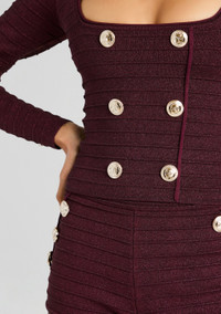 Indulge in luxury with our Clemence Bandage Knit Top. The square neckline and sleeves create a flattering silhouette for any occasion. With intricate button details, this top is an elevated essential for your wardrobe. Make a statement with this exclusive piece. - 60% Rayon, 32% Nylon, - 5% Metallic, 3% Spandex - Made in China - Model is 5'10", wearing size XS - Style No. - HL25-10716