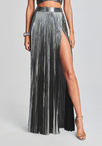 Our Cressida skirt takes the maxi style up a notch. This floor-grazing skirt is polished with a lustrous shine, while it's thigh-grazing slit is sure to make a statement. Style back to our strapless Sophia top for a lacquered pairing. Shown here in Gunmetal. - 95% Polyester 5% Spandex - Made in China - Model is 5'11" wearing size XS - Style No. HL23-6037