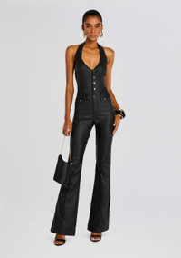 Calling all material girls——experience our coated denim. The Cynthia Jumpsuit is a retro-inspired silhouette that is perfectly complemented by just the right hint of stretch, creating a sexy, open back silhouette. Finishing touches include a button front, halter tie neck, and an elongated flare leg. Shown here in Coated Black. - 80% Rayon, 15% Nylon, 5% Spandex - Made in China - Model is 5'10" wearing size XS - Style No. FW22-5558R