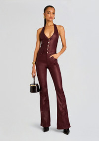 Calling all material girls——experience our coated denim. The Cynthia Jumpsuit is a retro-inspired silhouette that is perfectly complemented by just the right hint of stretch, creating a sexy, open back silhouette. Finishing touches include a button front, halter tie neck, and an elongated flare leg. Shown here in Coated Port. - 80% Rayon, 15% Nylon, 5% Spandex - Made in China - Model is 5'10" wearing size XS - Style No. FW22-5558R