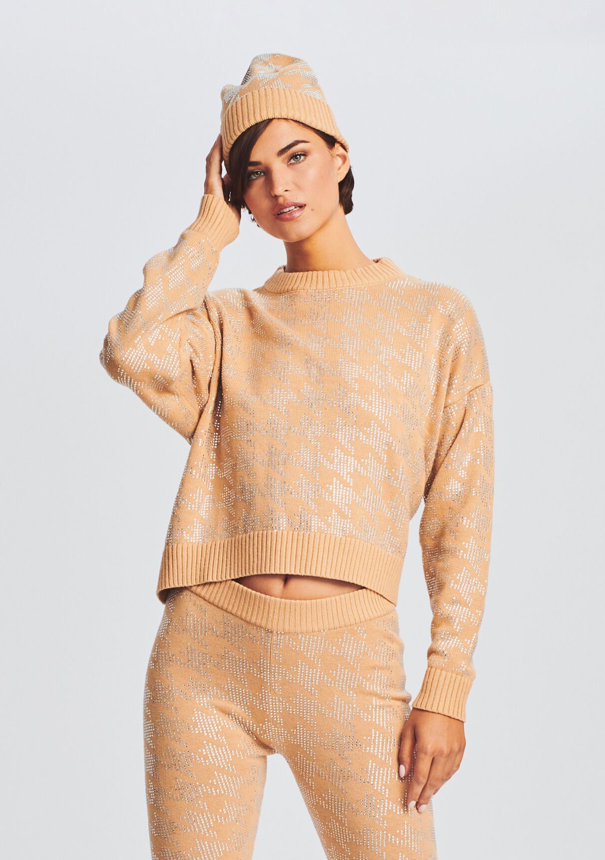 Our Delilah Beanie is one of the season's most-needed knits. Featuring a rhinestone houndstooth pattern throughout, this oversized beanie pairs perfectly with our Mal Sweater and Desiree Pants. Shown here in Caramel/Silver Houndstooth. - 92% Cotton, 8% Cashmere - Made in China - Dry Clean Only - Style No. FW22-5777