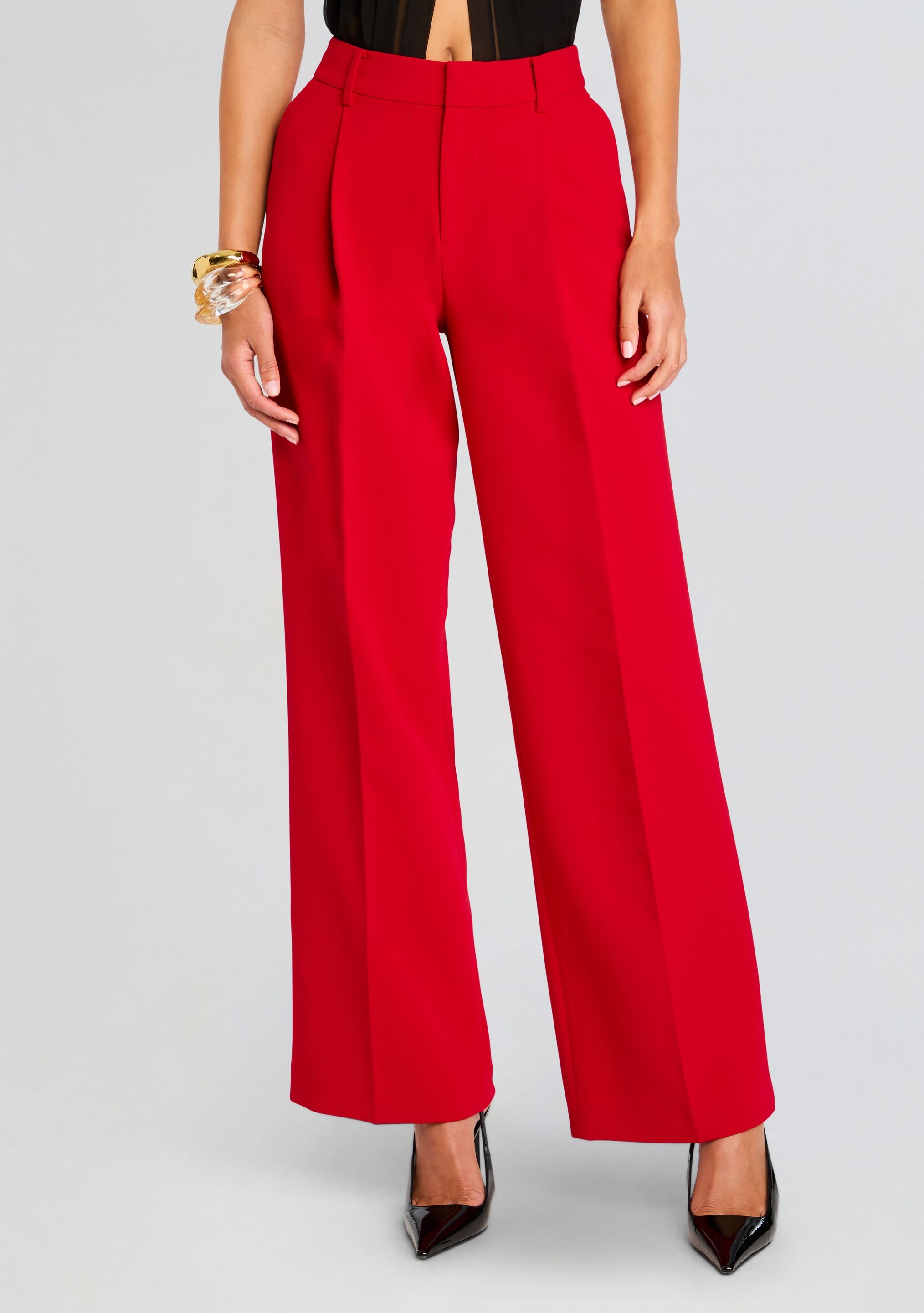 Elevate your style with our Desi Pant. The sophisticated red hue and pleated design make it perfect for any work environment. Transition from desk to drinks effortlessly, adding a touch of elegance to your everyday. - 100% Polyester - Made in China - Model is 5'10" wearing size S - Style No. - FW24-10142