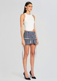 Embody retro charm with SER.O.YA's Finn Skirt featuring frontal hem zippered pockets and a stylish cargo design. Can be worn with or without cargo pockets. Shown here in Navy Stripe. ABOUT SER.O.YA Established in 2020, SER.O.YA is a New York-based ready-to-wear label founded with the intention to upgrade and refine your wardrobe. With a focus on crafting effortlessly cool and timelessly luxurious designs—SER.O.YA creates minimalist collections powered by maximum style. Everyday essentials in the form of breathable knits, vintage inspired denim, and ultra-luxe fabrications are interchangeably worn for easy dressing that never compromises. With versatility at its core, the brand’s simple yet significant aesthetic comes through in classic silhouettes that are anything but conventional. - 100% Cotton - Made in China - Model is 5'10" wearing size 26 - Style No. 3926-16