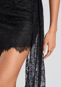 Exude elegance in our Harvelle Lace Dress. This mini dress features exquisite draped lace detailing, perfect for a night out or dinner date. Own the room and turn heads in this luxurious and sophisticated piece. - 100% Nylon - Made in China - Model is 5'10 wearing size S - Style No. R25-10606
