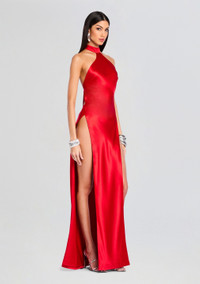Our Jagger Dress is a seductive silk gown. Punctuated by high slits on each side and an open back, this ultra-sexy silhouette maintains an air of refinement thanks to its high neck. Shown here in Red. - 76% Acetate, 24% Polyester - Made in China - Model is 5'10" wearing size XS - Style No. HL23-5772