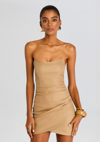Calling all material girls—experience our coated denim. The James Mini Dress is a short and sweet silhouette that makes a major impact. With an angular strapless neckline, sculpted bodice, and tulip skirt, dress the silhouette up or down. Shown here in Coated Tannin. - 80% Rayon, 15% Nylon, 5% Spandex - Made in China - Model is 5'10" wearing size S - Style No. FW23-5433