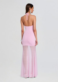 - 56% Viscose, 24% Nylon, 20% Silk - Made in China - Halter neck with tie - Sheer skirt - Style No. - S-SS26-5580-17