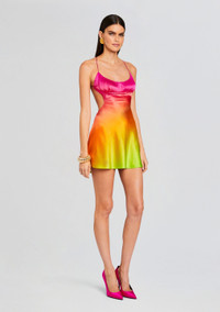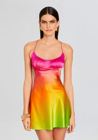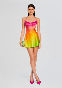 Discover vibrant elegance with our Josefine Dress—a captivating mini dress adorned with a radiant blend of colors and an alluring open back. Crafted from luxurious silky fabric, this dress effortlessly combines sophistication with a touch of playful allure. The colors of this dress makes a bold and stylish statement, allowing your individuality to shine through effortlessly. The delicately designed open back adds a hint of charm, offering a subtle yet chic detail to the dress. Shown here in Pink Lime Ombre. - 95% Silk, 5% Spandex - Made in China - Model is 5'10" wearing size S - Style No. - R24-8319