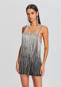 Step into a world where elegance meets innovation with our extraordinary Juliette Dress. This one-of-a-kind piece features a square neck, captivating fringe embellishments, and a captivating open back. The fringe embellishments are not just a design; they're a statement. With every sway and twirl, they create a mesmerizing movement, catching the light and drawing all eyes toward you. Shown here in Black/Silver. - HANDMADE - 100% Polyester - Made in India - Model is 5'10" wearing size XS - Style No. - HL24-8023